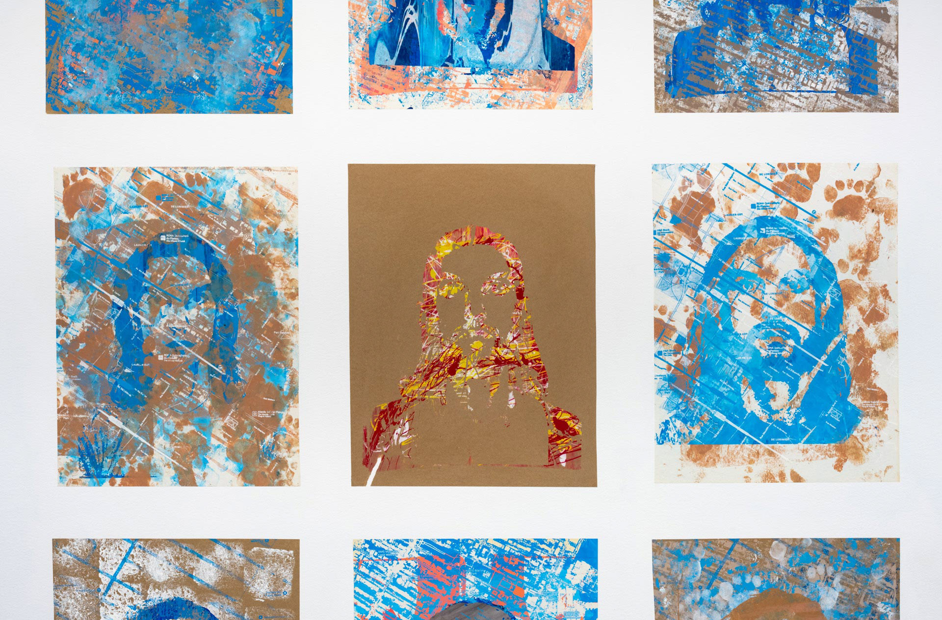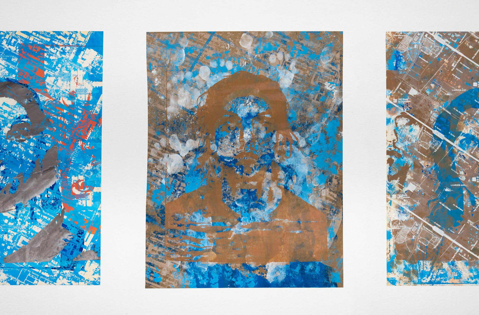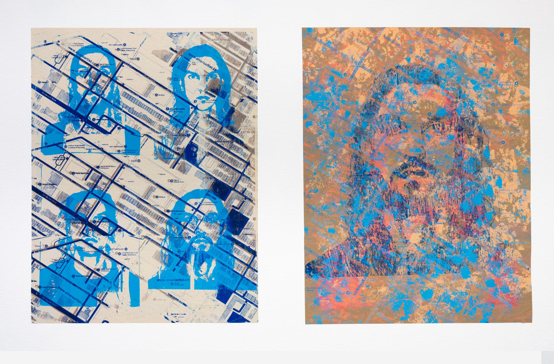 Revisiting his personal archives, Alvaro rediscovered a series of official 2 × 3 inch photographic portraits produced since his arrival in Canada. Though originally intended for administrative use, these images—marked by institutional portrait conventions—became tools to explore identity across multiple representations of himself. Combined with GPS-generated urban maps of Montreal neighborhoods where he lived, the work investigates the reciprocal relationship between identity and territory. Technically, the project is guided by symbolic materials such as snow and sand, experimental approaches to color, and the use of both “humble” and “prestigious” papers. Finally, the circulation of images between institutional exhibition spaces and unauthorized public displays questions how images are seen, valued, and received inside and outside the gallery context.